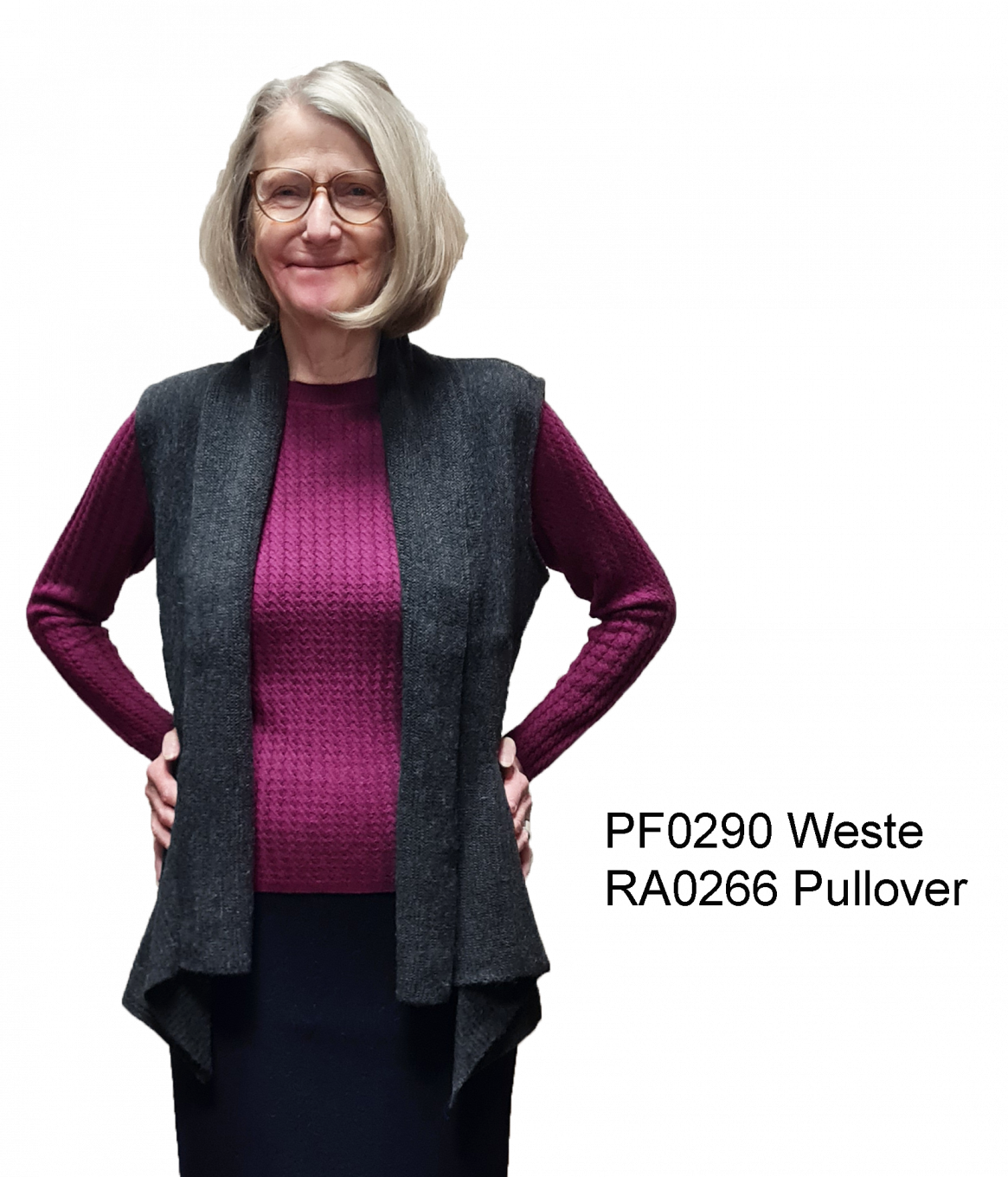 Die Weste mit dem gewissen Etwas: Ein klassischer Schnitt in A-Linie, leichter Alpaka-Strick und der Schalkragen sorgen für sportliche Eleganz, geometrische Details am Westensaum setzen bei unserem Modell „Triest“ reizvolle optische Akzente.