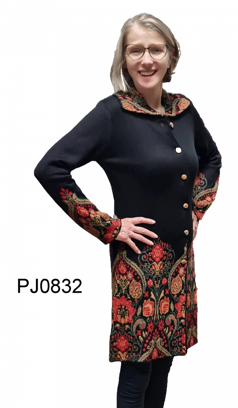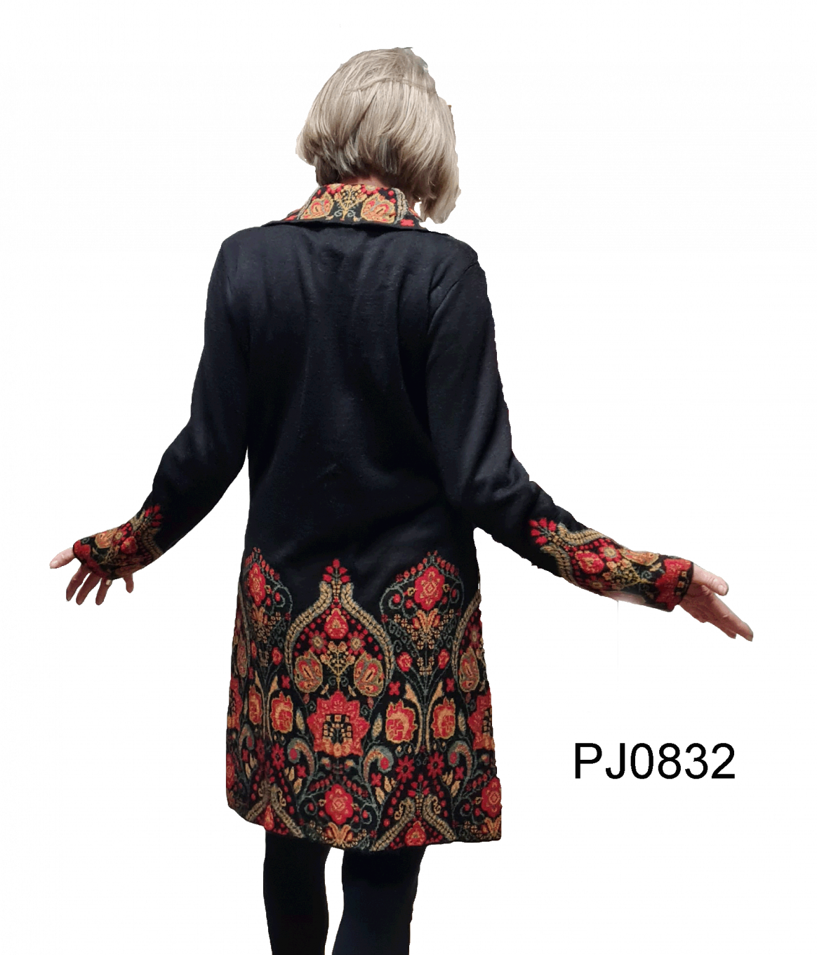 Das orientalisch inspirierte Design zieht bewundernde Blicke auf sich: filigrane Muster und harmonische Details verleihen dem schwarzen Mantel eine geheimnisvolle, kunstvolle Note, die sowohl Tradition als auch moderne Ästhetik widerspiegelt.